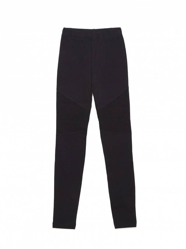 Легінси жіночі із трикотажного полотна. По переднім половинкам на рівні коліна обробна деталь з трикотажного оздоблювального полотна. Верх виробу оброблений широкою гумкою швом у підгинання. По швах приточування оздоблювальної деталі, шву приточування пояса виконано оздоблювальну строчку.