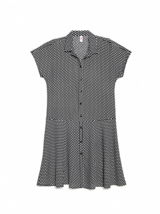 Сукня жіноча з текстильної тканини з набивним малюнком, По переду притачная планка з гудзиками. Комір відкладний з відрізною стійкою.